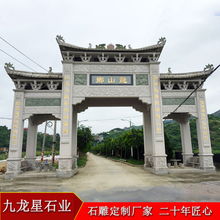 關于更多的石雕牌坊設計尺寸及村口石雕牌樓多少錢、制作樣式圖片請致電我們或者在線留言,九龍星石業從事石牌樓制作多年,專業的石牌樓設計,高超的石雕牌坊雕刻手法,為眾多的客戶設計雕刻了各式各樣的石雕牌坊,以較優惠的價格及精湛的雕刻工藝,供廣大用戶考察定購。