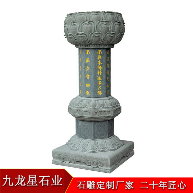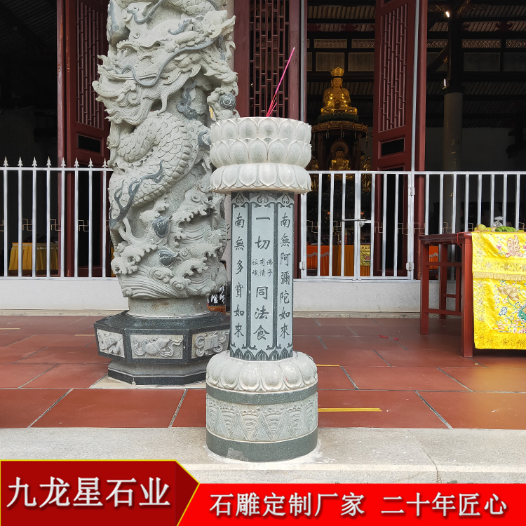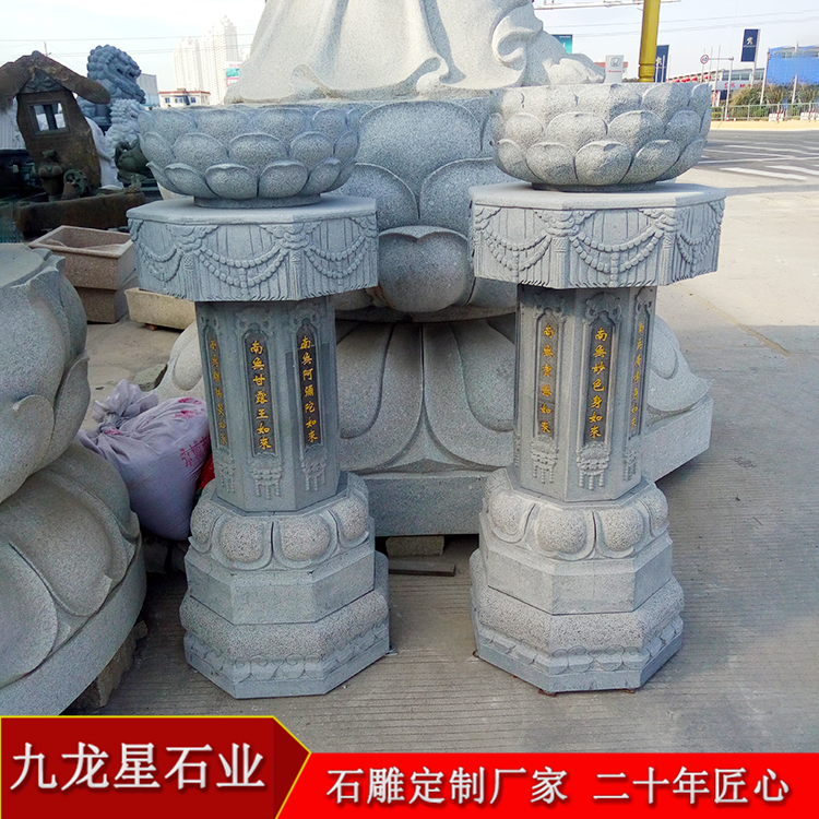 出食臺石雕雕刻是由各種天然石材制作而成的,擺放在寺院大雄寶殿兩側,用以盛放食物的用品。所放的食物較早是給以為叫做鬼子母神的佛教弟子食用,后面逐漸成為寺院建筑的一種必須擺件,其寓意也逐漸轉變為寺院為八方群眾提供食物。