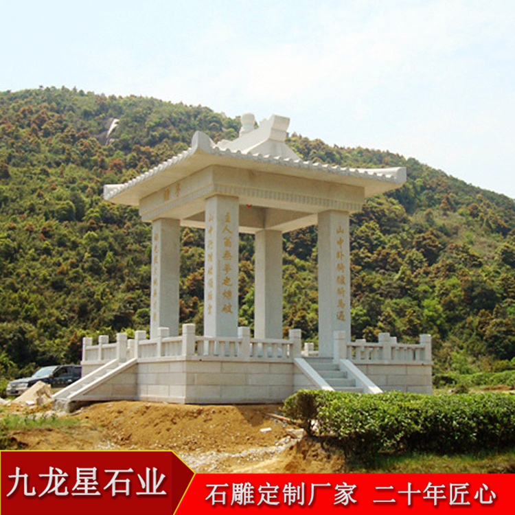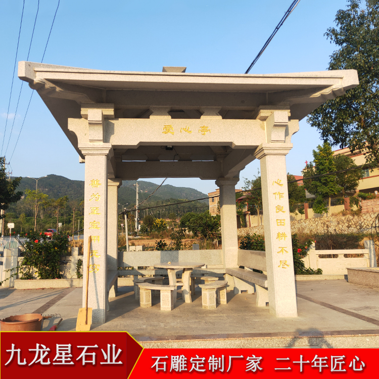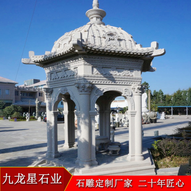 一座石雕涼亭報價多少錢與石料選擇有關,制作石材的選擇有很多,一般有花崗巖、大理石系列石材,其中花崗巖的石材品種繁多,各地的芝麻白、芝麻黑、青石等都是可以制作涼亭的,大理石類的石料則一般為漢白玉和晚霞紅兩種。石雕涼亭造型優美,不僅僅是供人休息的場所,已兼具裝飾性和實用性于一體了,被廣泛用于公園、廣場、寺廟、景區以及別墅庭院內等各個地方。