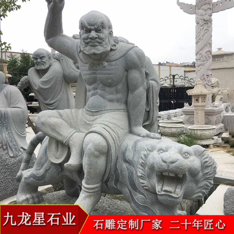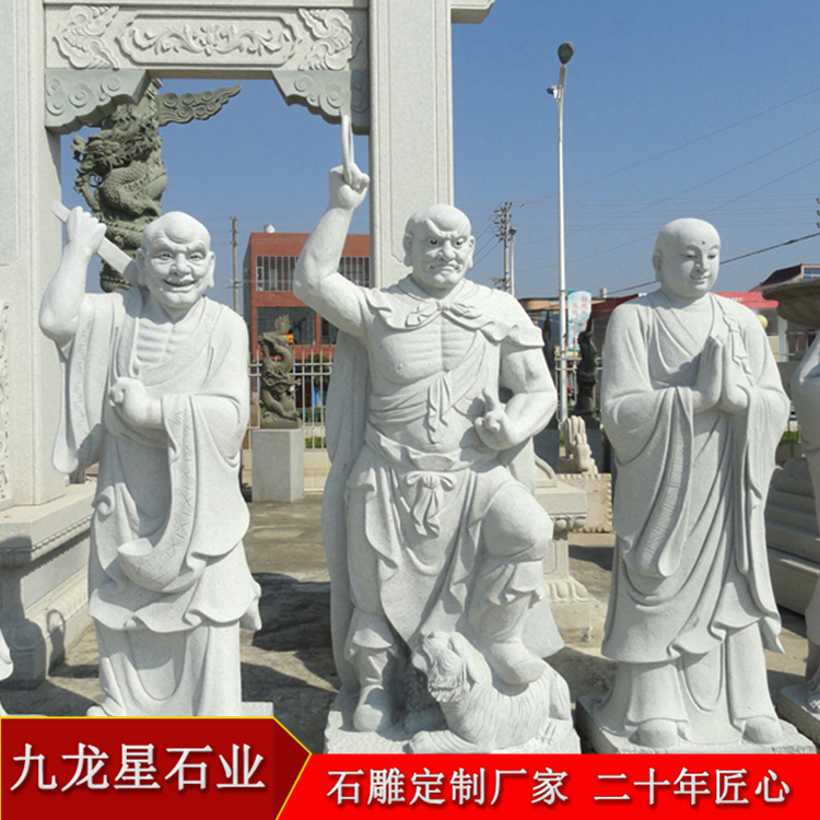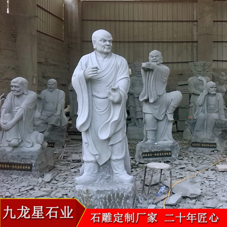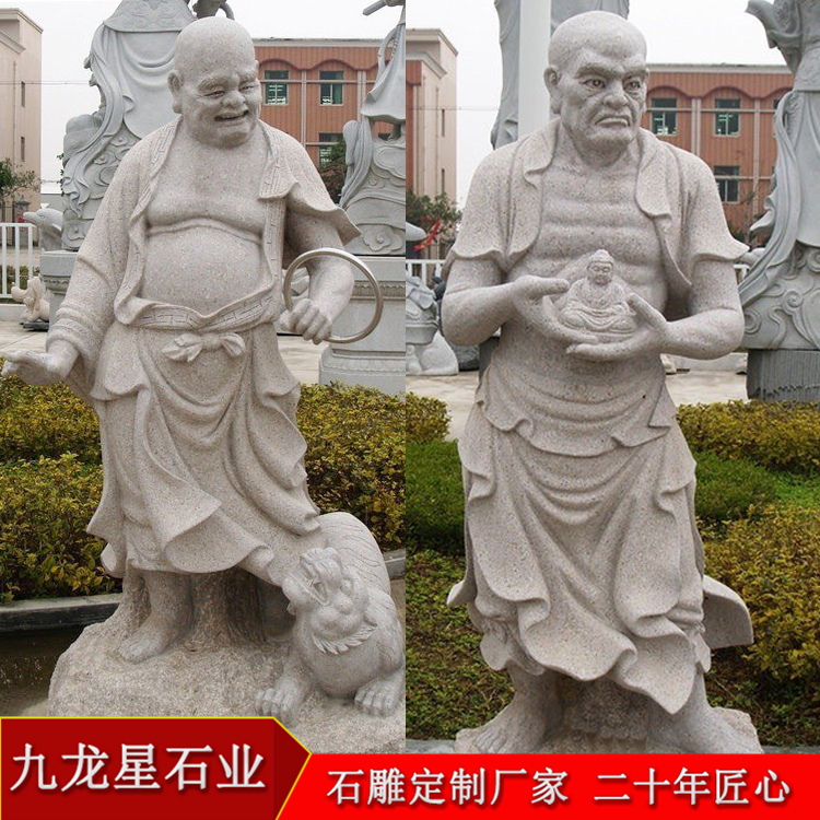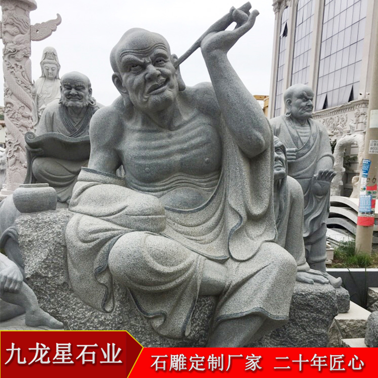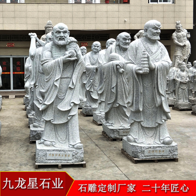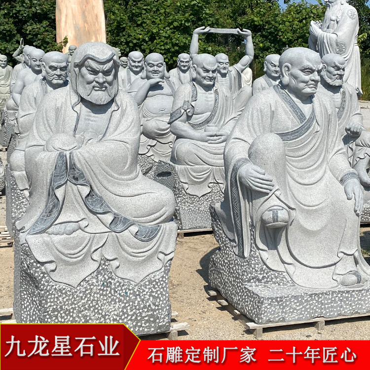 寺院石雕十八羅漢是中國佛教的文化展示,是指駐守在民間的十八位釋迦牟尼弟子,能夠守護世間的平和。中國是從唐代開始流行石雕十六羅漢,后來到了唐朝末年,加入了兩位尊者,變成了石雕十八羅漢,是佛教寺院中的主要佛像雕刻選擇,幫助指導民間眾生,守護一方的祥和太平。