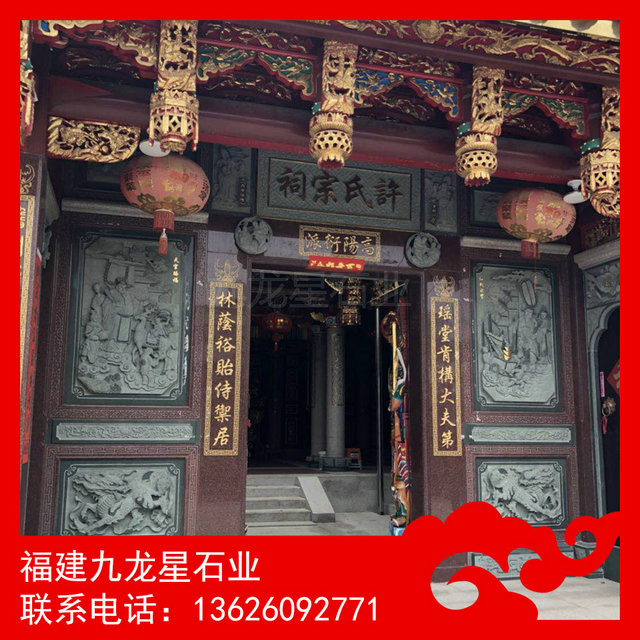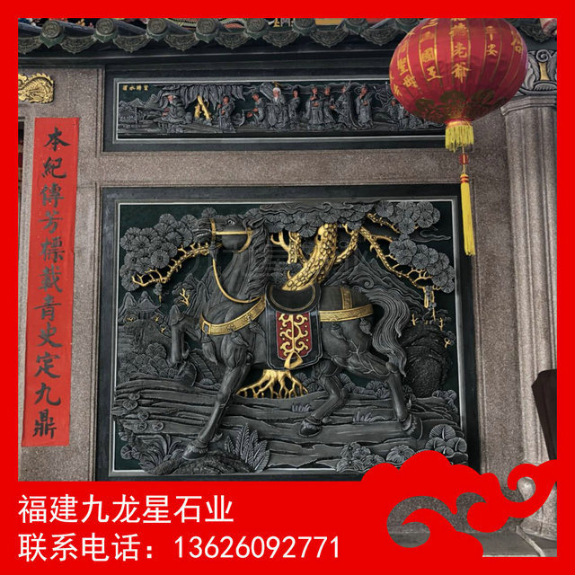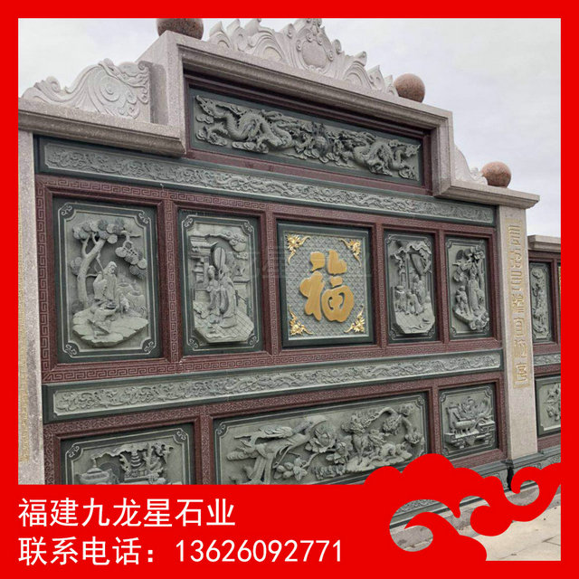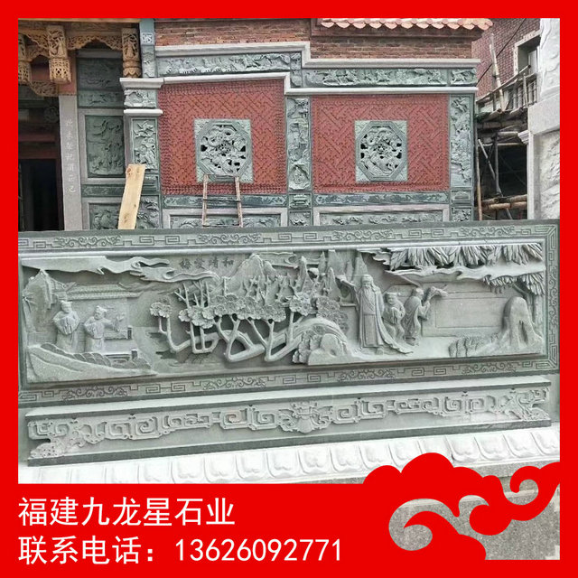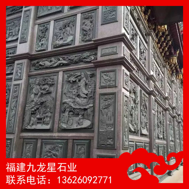 寺廟浮雕 祠堂浮雕 祖厝浮雕 宗祠浮雕墻——現在很多寺院寺廟祠堂都普遍會采用浮雕來裝飾外墻,佛教寺院浮雕墻所雕刻的內容涵蓋了許多方面,有的是寺院的歷史沿革,有的是諸佛菩薩的經典典故,有的則是寺院供奉主佛、菩薩的一些人物故事,這些所稱的故事中必然是在佛經中有明確記載的。這種浮雕墻一般會采用青石或芝麻黑花崗巖石料,是因為這些石材的顏色相對深一些。在雕刻較多的人物形象時,青石浮雕可以清晰地體現出來,包括人物的每一個動作,而這是其他石材沒辦法達到的效果。