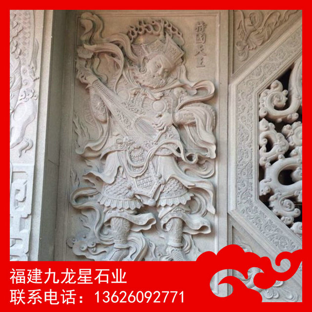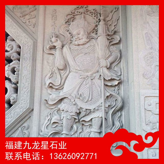 四大天王浮雕 寺廟佛像浮雕——又稱護世四天王,是佛教的護法天神,俗稱“四大金剛”。四大天王為二十諸天中的四位天神,位于第一重天,第一重天又叫四天王天。根據佛教經典,須彌山腹有一山,名犍陀羅山,山有四山頭,各住一山各護一天下(四大部洲,即東勝神洲、南贍部洲、西牛賀洲、北俱蘆洲),故又稱護世四天王 ,是六欲天之第一。他們的神像通常分列在凈土宗禪宗佛寺的第一重殿兩側,因此又稱天王殿。