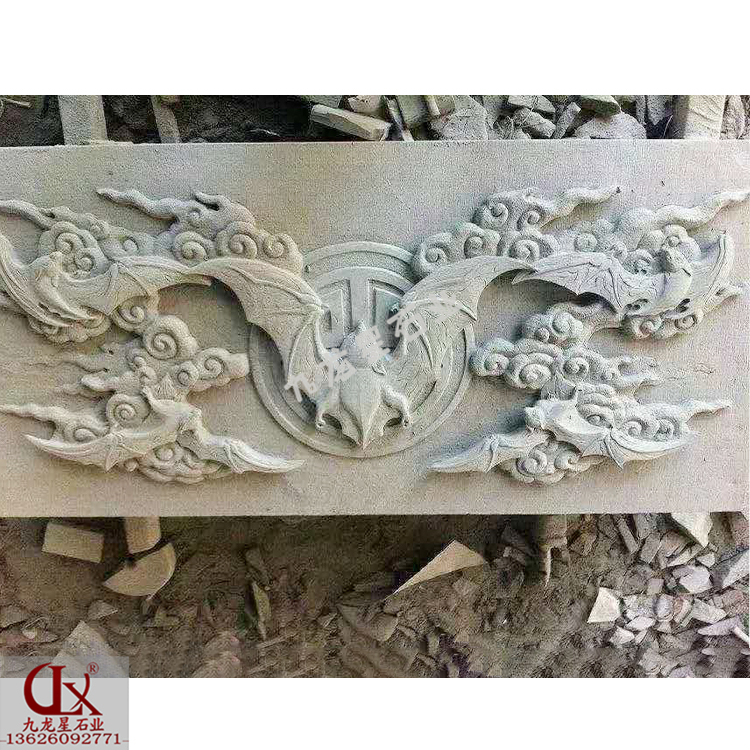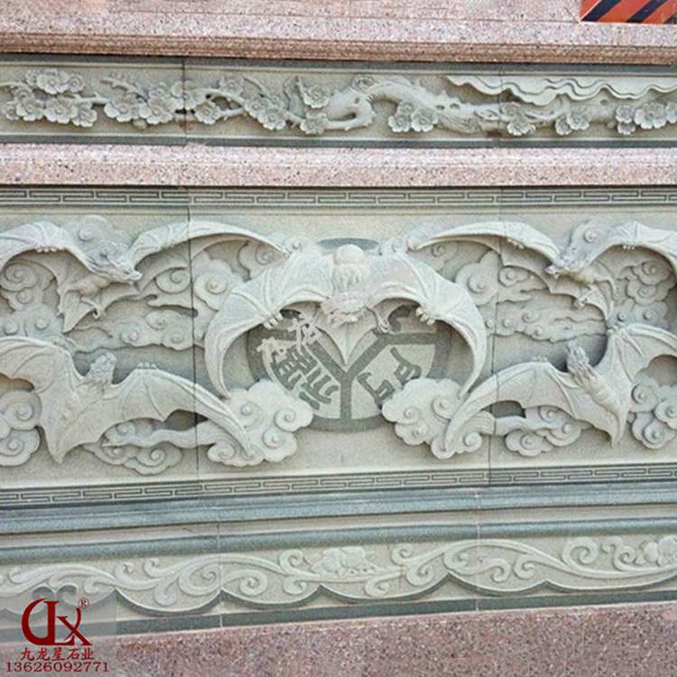 青石浮雕五福臨門因“蝠”與“福”諧音,蝙蝠也被人們用其形象來表示福氣,將“福”字形象化。比方說,中式石刻浮雕設計中是兩只蝙蝠并在一起,寓意“雙重福氣”,從盒中飛出五只蝙蝠,則表示“福和合”,五只蝙蝠稱“五福臨門”,童子捉蝙蝠放到瓶中,為“平安五福”,蝙蝠飛到紙上停留,是“引福歸堂”等。其中以青石浮雕五福臨門為廣見。