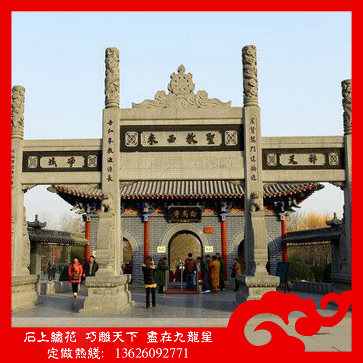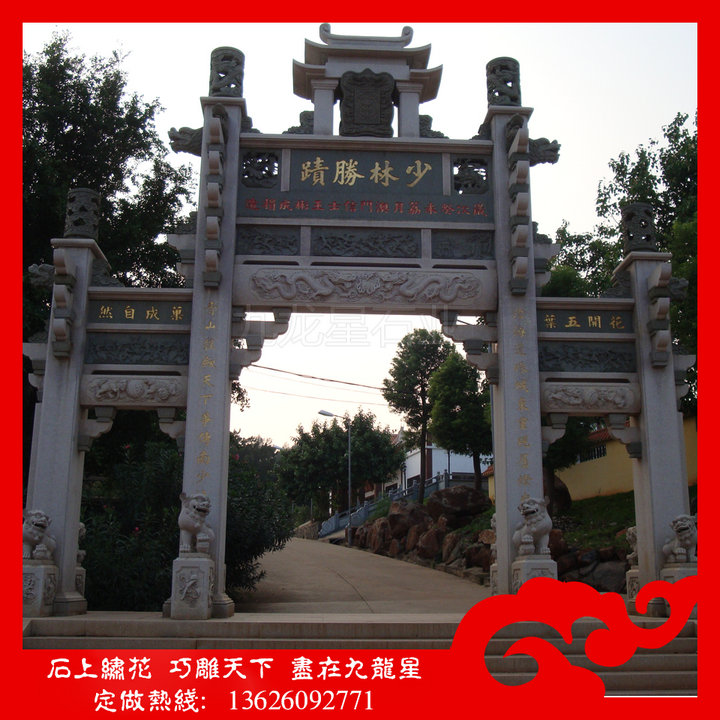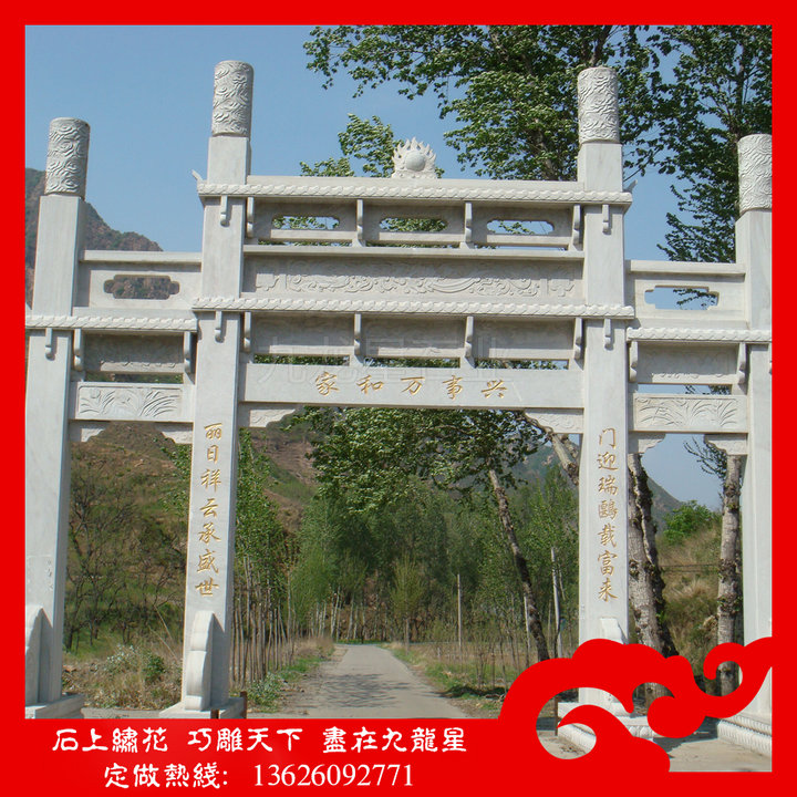 山門牌坊都是采用天然石材雕刻而成的,有大理石牌坊、青石牌坊、花崗巖石牌坊等等,其中數大理石牌坊應用較為廣泛。山門牌坊不僅建筑結構自成一格,別具風采,而且集雕刻、繪畫、匾聯文辭和書法等多種藝術于一身,熔古人的社會生活理念、封建禮教、封建傳統道德觀念、古代的民風民俗于一爐,具有瑰麗的藝術魅力、很高的審美價值和豐富而深刻的歷史文化內涵。每一座山門牌坊都是一件石雕工藝品。中國傳統的石雕技法圓雕、透雕、高浮雕、淺浮雕、平浮雕、陰線刻等,在石牌山門牌坊的雕刻中都廣為應用。