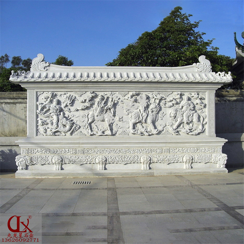 石雕照壁浮雕圖片有一字形、八字形和撇山式等類型。民間雕刻的石照壁,一般用于壁頂、檐口、須彌座、壁心等部位,也用全部都是石材雕刻的。壁心的雕刻主要以兩種構圖方式為主:規范的構圖常以線腳或紋樣圍合成長方形的“池子”,分別雕刻四角岔花和中心花;隨意的構圖,其形式不拘一格,構圖與一般繪畫相仿。照壁上的雕刻題材廣泛,包括福、祿、壽、喜等漢子,以及寓意吉祥的人物、動物、花草等。