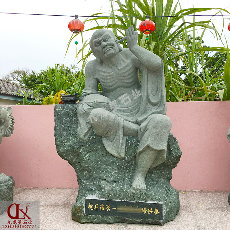 用于室外擺放的石雕十八羅漢坐像圖片通常建議用花崗巖石材雕刻,按順序擺放在兩側(cè)。漢傳佛教的的石雕十八羅漢隨著雕塑文化的發(fā)展,造型有立像、坐像、坐立結(jié)合的三種雕刻方式。