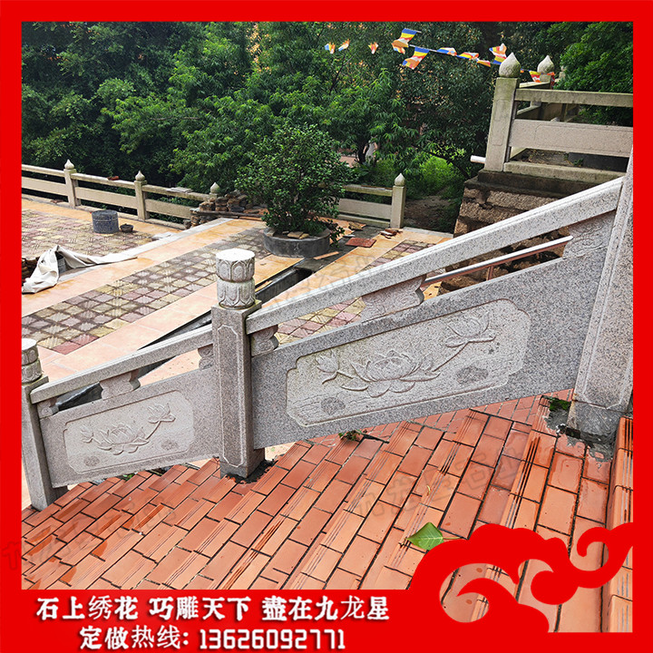 福建省石欄桿廠家在雕刻欄板的浮雕一般還是以五谷豐登,吉祥如意為主,植物的浮雕有棗子、石榴、蓮花、葫蘆,神獸一類的有麒麟呈祥、龍鳳如意、福在眼前等,這些古建橋欄桿圖片的浮雕內容能帶來吉祥、去除災難,也寄托了我們大眾百姓的美好追求和愿望。