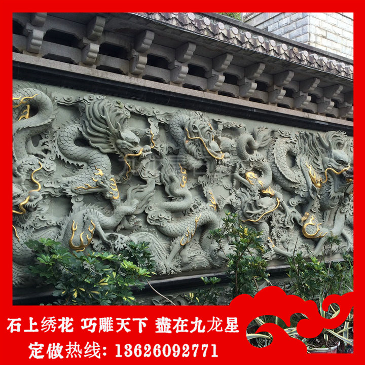 現代社會石雕九龍壁浮雕圖片的雕刻得以廣泛使用,是人類出于營造樣瑞生存環境的初衷,用龍鳳等吉樣如意的閣案來去除民間禁忌,以寄托追求美好的心愿。就其功能和寓意,涉及納吉、勉勵、祈福、警戒、除惡等諸多內容。吋代在推進,人類文明在演化,社會的審美情趣和觀念意識也在不斷地發展變化,似就其普遍心理和根本價值早已沉淀在人們內心。傳統的吉祥九龍壁浮雕雕刻圖案也常常出現在現代的家居雕刻中,有的時候在石雕九龍壁浮雕周圍在襯托上的蝙幅、桃子、海棠,書法對聯等,共同表達著人們對福、美好生活的追求。