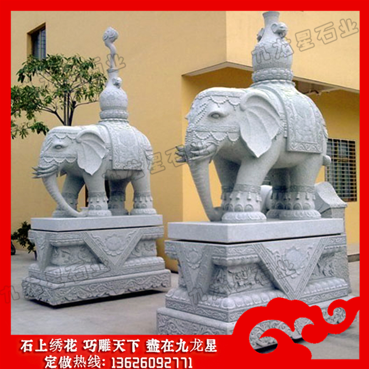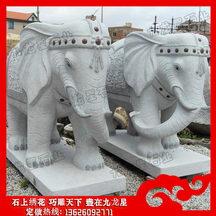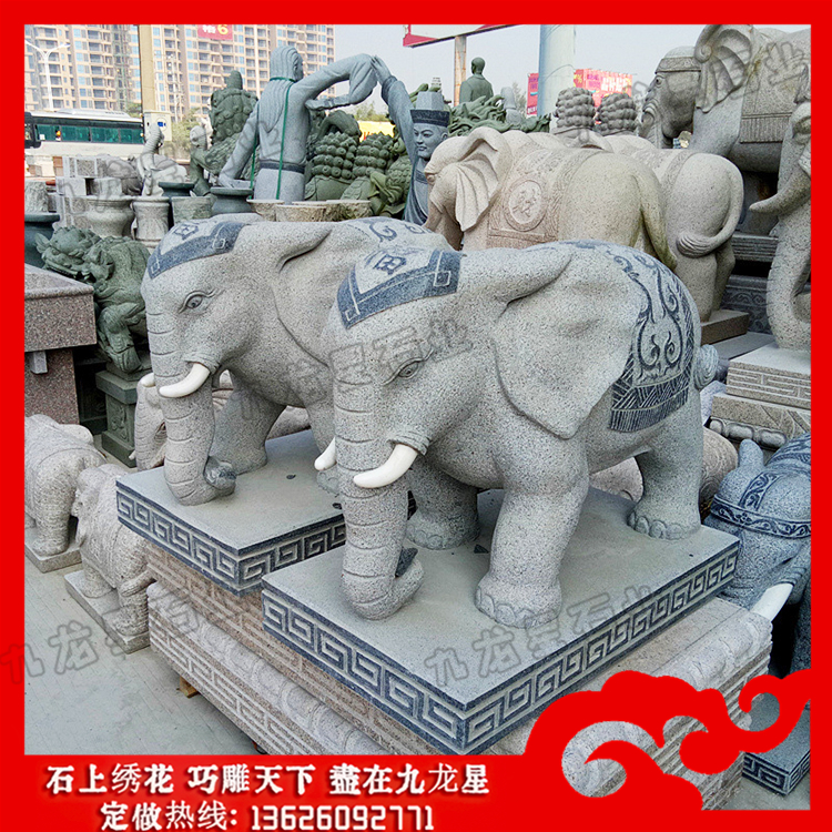 寺院石雕大象加工制作的造型一般為六牙象,身上雕刻具有寺院或佛教代表寓意的圖案,做工精細,六牙整齊,擺放在山門前面或是寺院大殿入口處,可以很好地裝飾門面。石頭制品擺放在室外可持續成百上千年之久,就算建筑物不斷重修,石雕大象依然可以屹立不倒。文革時期古剎寺廟被毀,zui終能尋回遺跡并還原原貌靠的就是門口的石雕大象擺件或者其他石雕。