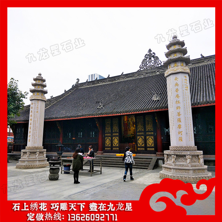 從現(xiàn)在的寺院建筑實(shí)例看,石雕石經(jīng)幢多立于佛寺大殿前的左右兩側(cè),它們已經(jīng)成為一座佛寺建筑群體中的一個(gè)有機(jī)的部分。既然石雕石經(jīng)幢具有消災(zāi)免罪的功能,所以有的已經(jīng)被用到佛寺以外的地方去了。其一是立在城市的街頭以求百姓的免災(zāi)祈福,可稱為“路幢”;其二是建于陵墓之前以求對(duì)墓主人超度亡靈,早日走入冥間天堂,可稱為“墓幢”。常見(jiàn)石雕石經(jīng)幢圖片樣式有很多,九龍星石業(yè)歡迎您帶圖咨詢。