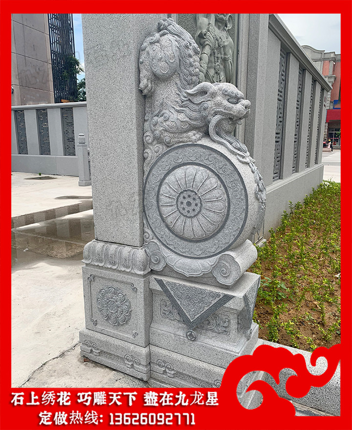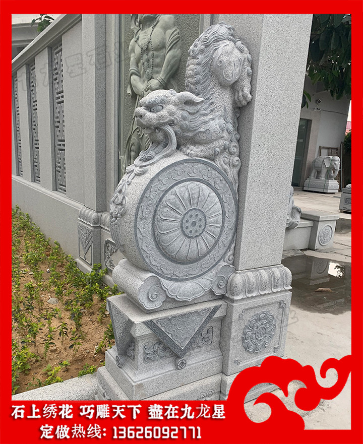 石雕雕塑抱鼓石是作為承托和穩定門板門軸、加固或安裝門檻的一個構件,有利于防止門板受外力晃動,大大增強門框的穩定性,起到聯系門檻的作用。另經枕石墊高后還可以防水防潮。外部抱鼓石主要是承擔著大門板的平衡重功能,以其前部的重量來平衡門板轉動時的重力。