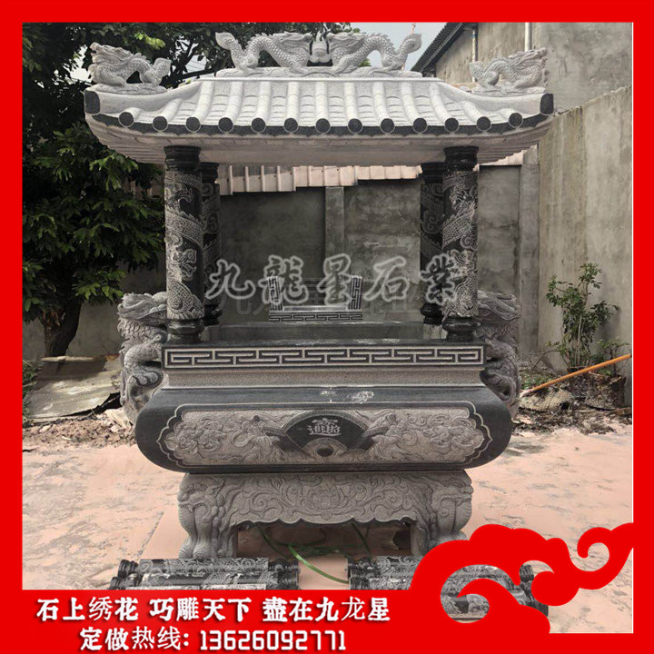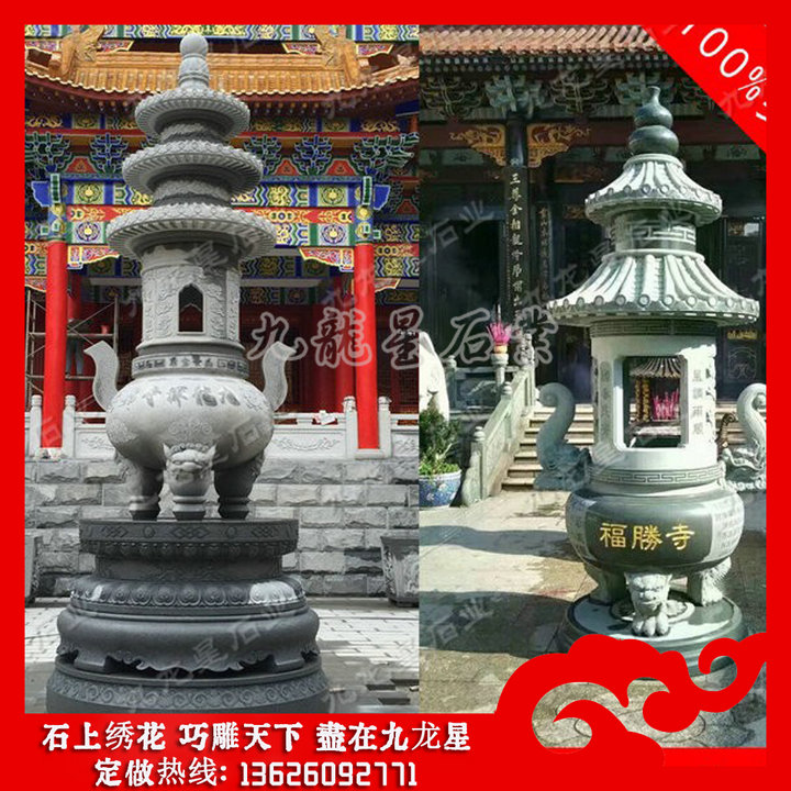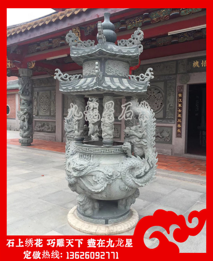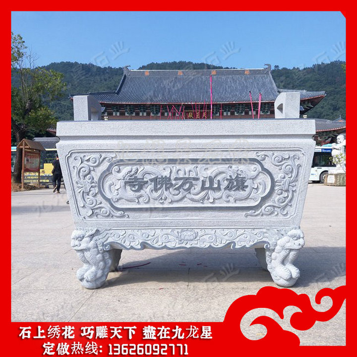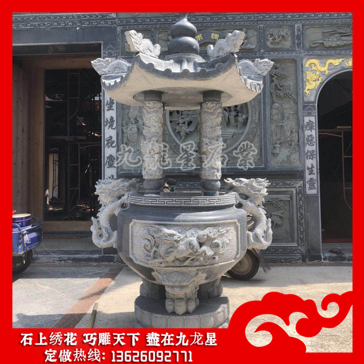 石雕香爐采用優質青石精雕細琢而成。石雕仿古香爐的兩邊的龍栩栩如生。石雕香爐圖片及價格在形狀上常見為方形或圓形,方形的香爐一般有四足;圓形的香爐,都有三足,一足在前,兩足在后放置。而我們在寺院中多見于圓形的香爐,此香爐都有三足,一足在前,兩足在后,是如法的放置;常以之譬喻佛教中的三寶,缺一不可。石雕仿古香爐種類繁多,不同形狀的香爐,供在不同的位置、焚燒不同的香。