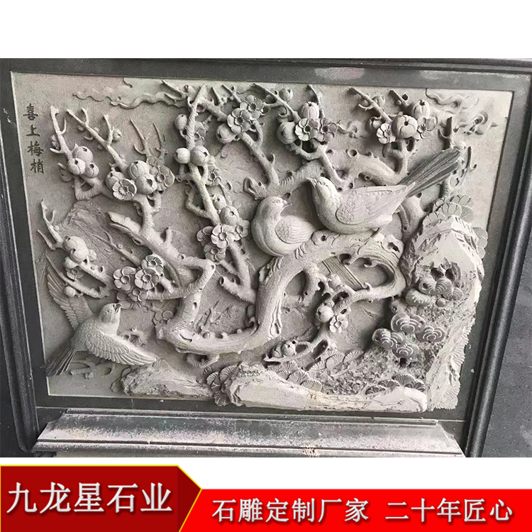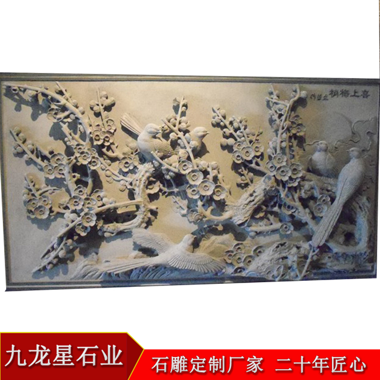 寺院喜上眉梢石浮雕 石雕浮雕仙鶴圖片大全——九龍星石業,二十年雕刻工藝。 寺院喜上眉梢石浮雕是中國傳統吉祥紋樣之一。古人以喜鵲作為喜的象征。《開元天寶遺事》:“時人之家,聞鵲聲皆以為喜兆,故謂喜鵲報喜。”《禽經》:“靈鵲兆喜”。可見早在唐宋時代即有此風俗。當時的銅鏡、織錦、書畫等,已有很多喜鵲的題材。同時,我國人民以所喜愛的梅花諧音“眉”字,畫喜鵲站在梅花枝梢,即組成了“喜上眉(梅)梢”的石浮雕吉祥圖案。近代常見用于剪紙和木雕、石雕等上面。石雕浮雕仙鶴圖片大全也是浮雕壁畫中比較常見的一種圖案,通常雕刻在寺院墻面上或者庭院的照壁。