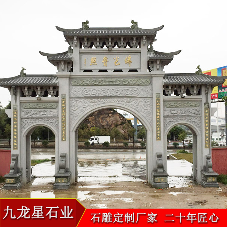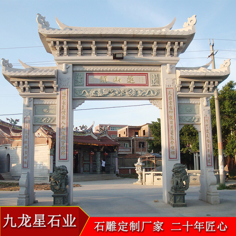 石牌坊又稱石牌樓,在封建社會是為表彰功勛、科第、德政以及忠孝節義所立的建筑物。以景園、街道、陵墓前、寺院為多。寺院牌坊一般都是立于寺院的入口處。村口石牌坊一般也是立于村莊入口處,或者于街道上。石牌坊哪家好?找九龍星——20多年的石牌坊雕刻廠家,有著很多石牌坊的成功案例,是你不錯的選擇!