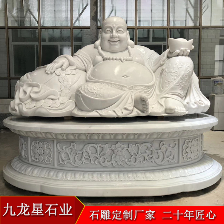 常見的石雕彌勒佛雕塑圖片是賢劫第五尊佛,也是代表將來的一尊福佛,其石雕像一般分為兩種,一種是坐著的,一種是站立的。不管是站著的還是做著的石雕彌勒佛雕塑都大同小異,只是身體姿勢不同罷了。不管是站著的石雕彌勒佛像還是坐著的彌勒佛像,他們都敞開胸懷,撇肚大笑,左手拿蒲扇,右手拿佛珠,雕刻而成的彌勒佛像跟歷史記載一樣也是赤腳的,相傳彌勒佛經常云游四海,給人們送去吉祥,消災免禍、帶去福康。