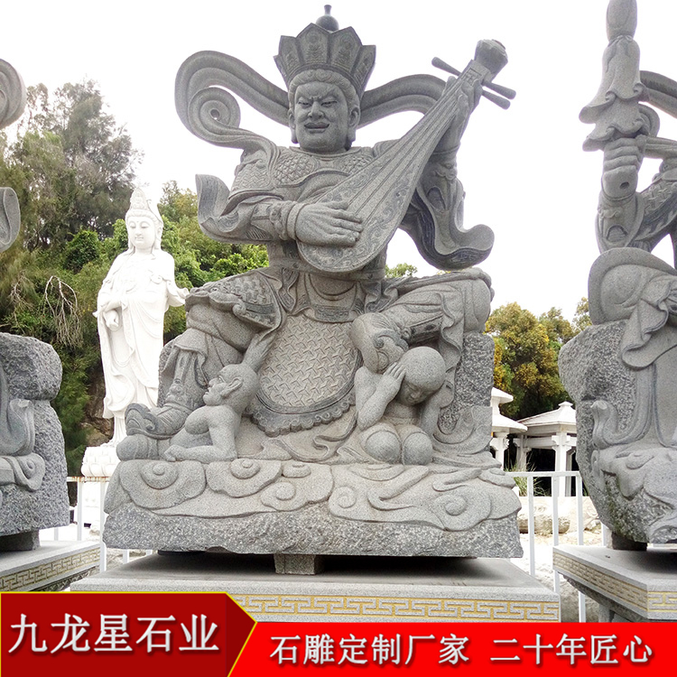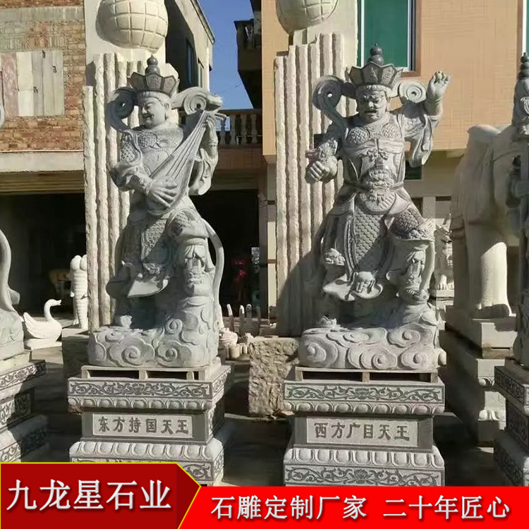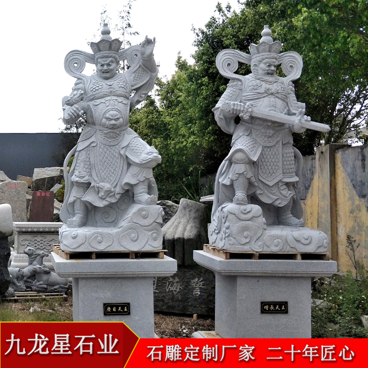 四大天王石像,是佛教的護法天神,又稱護世四天王。石雕四大天王分別是東方持國天王多羅吒、南方增長天王毗琉璃、西方廣目天王留博叉、北方多聞天王毗沙門。石雕神像中的西方廣目天王,他能以清凈法眼觀察護持三千大千世界,護持人民。他懲惡護善不是靠殺,而是把帶人抓起來后,讓他改邪歸正,故此圣名。西方廣目天王,也是“二十諸天”中的第六天王。