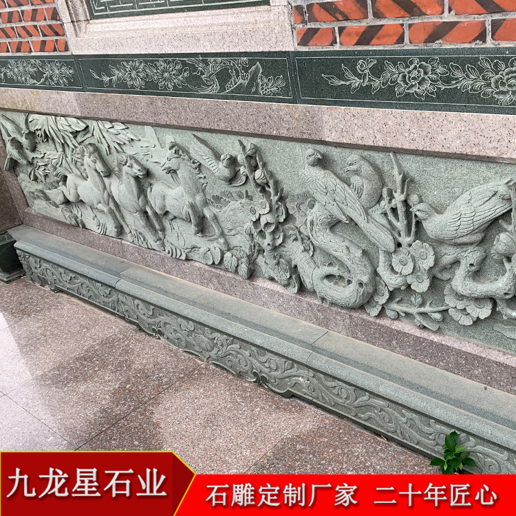 佛教寺廟石雕壁畫圖片大全集建筑裝飾的工藝技法可主要分為:淺浮雕、深浮雕、透雕幾種,浮雕價格淺浮雕較便宜一般幾百元一個平方,深浮雕價格在一千左右,透雕價格在兩三千元一個平方,石材分為普通青石、綠色青石、花崗巖浮雕,其中綠色青石價格較高,其次是普通青石、和花崗巖浮雕價格基本差不多,不同的石雕壁畫圖片裝飾工藝技法產(chǎn)生不同的裝飾視覺感受。